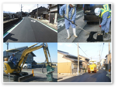 経年劣化による損傷の激しい、県道名和名和停車場線の路面を修繕、補修を行うことにより、安心で安全な交通環境を創出する工事です。
